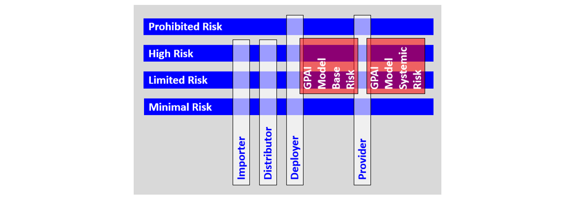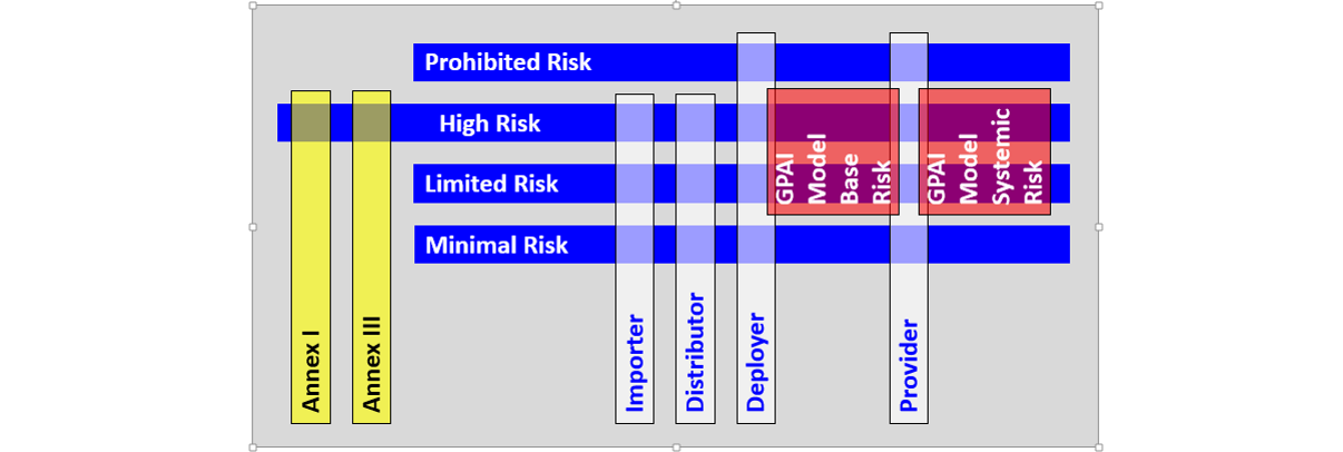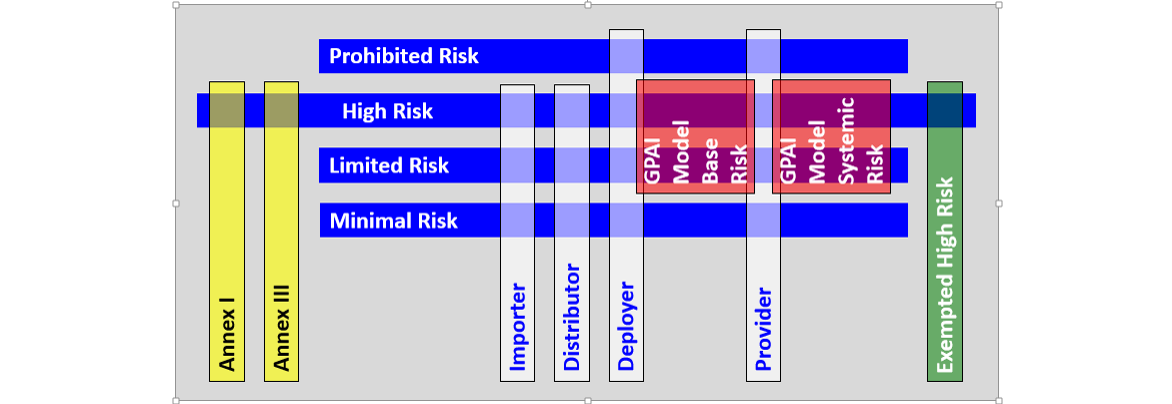The second dimension is visualized in white above and should not come as a surprise to any of you. If it is a surprise, read my post about identity management. The key lesson for those of you working with high risk is that Provider high-risk requirements are not the same as say, Deployer high-risk requirements or Importer high-risk requirements.